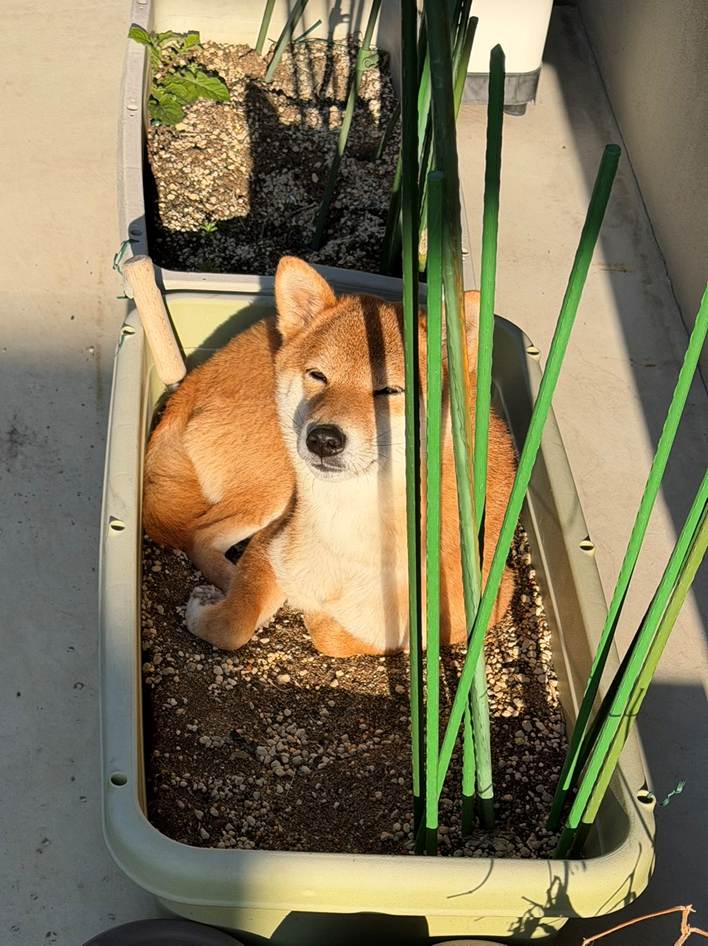 土の上という意外な場所ですが、本人的には一番落ち着く場所だったのかもしれません。